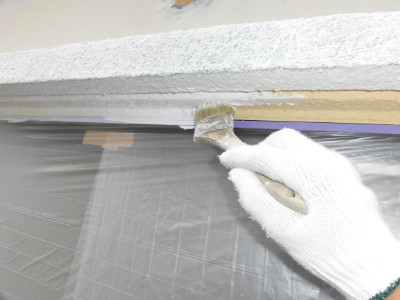 外壁下塗りをハケ・ローラーで塗布しました。